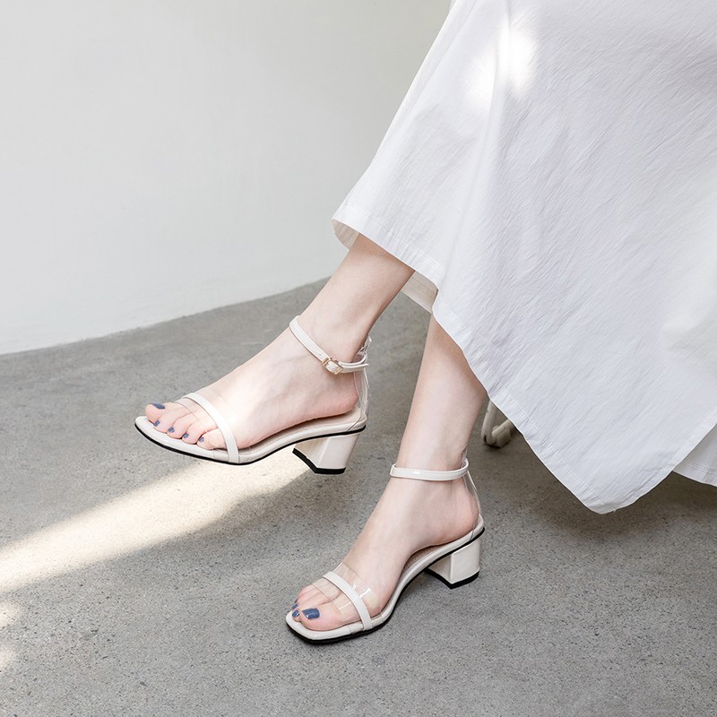 涼鞋女2019夏新款粗跟高跟鞋百搭網(wǎng)紅仙女風(fēng)一字帶透明膠片女鞋子