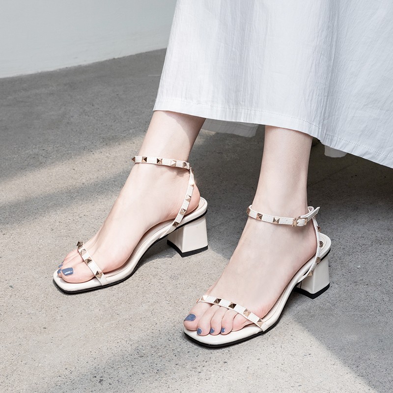 涼鞋女2019夏季新款粗跟高跟鞋網(wǎng)紅仙女鉚釘一字帶中跟大小碼女鞋